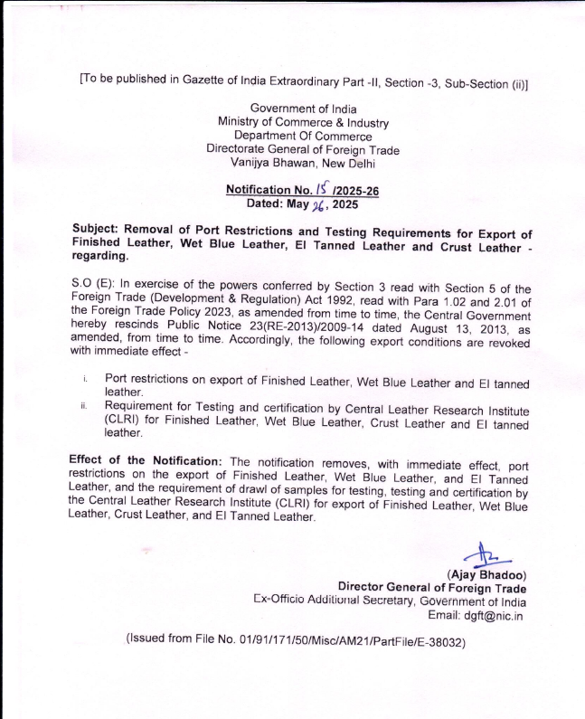 In a landmark decision, the Directorate General of Foreign Trade (DGFT) has issued Notification No. 15/2025-26 dated May 26, 2025, revoking several key restrictions on the export of finished leather products. This move is expected to provide a major boost to Indian leather exporters, enhancing global competitiveness and ease of doing business.